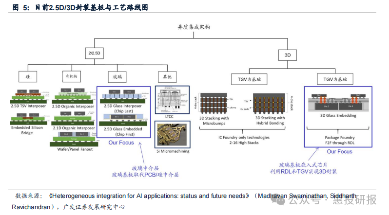玻璃材質(zhì)的引入可以取代原先的硅中介層和有機基板。玻璃基板直接利用玻璃中介層(GlassInterposer)實現(xiàn)芯片之間、芯片與外部的互聯(lián),利用玻璃材質(zhì)成本低、電學(xué)性能好、翹曲低等優(yōu)點來克服有機物材質(zhì)和硅材質(zhì)的缺陷,來實現(xiàn)更穩(wěn)定、更高效的連接以及降低生產(chǎn)成本,有望為2.5D/3D封裝帶來全新的范式改變。