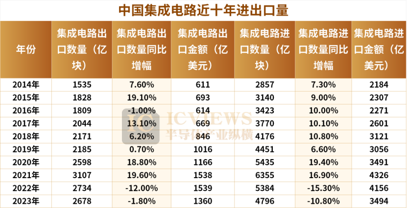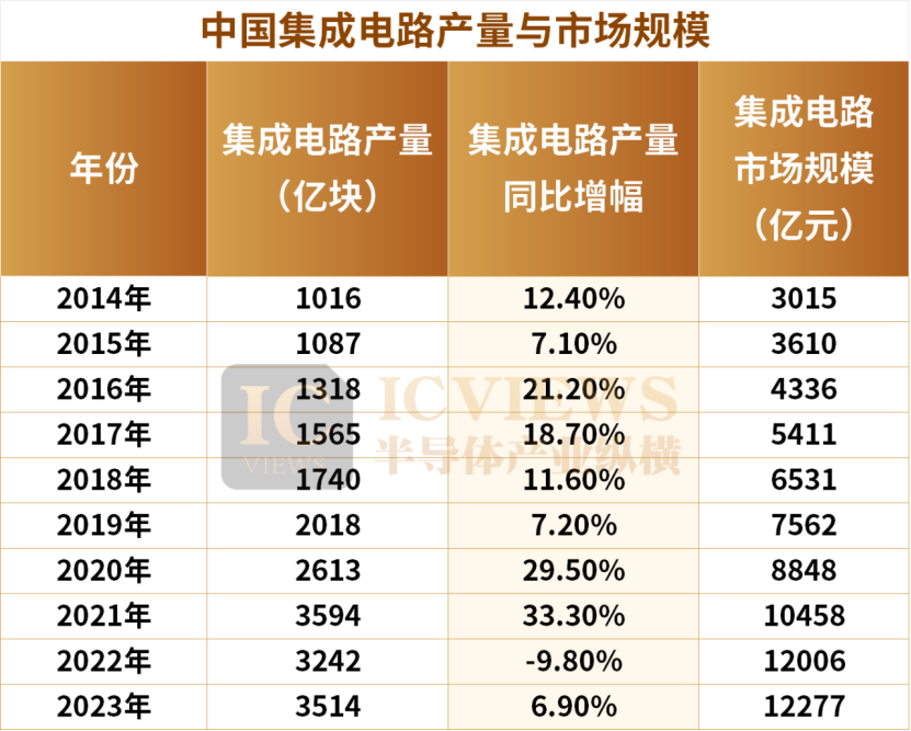 集成電路作為信息技術(shù)的核心,已成為競(jìng)爭(zhēng)力的關(guān)鍵要素。面對(duì)這一趨勢(shì),國(guó)內(nèi)正以前所未有的決心和力度,加大本土集成電路產(chǎn)業(yè)的發(fā)展步伐。上圖所示,自2014年以來,中國(guó)集成電路產(chǎn)業(yè)市場(chǎng)規(guī)模一路攀升,集成電路產(chǎn)量也快速增加。之后在2020年與2021年前后迎來高速上漲,產(chǎn)量同比增長(zhǎng)率達(dá)29.5%、33.3%。與進(jìn)出口數(shù)量境遇相似,2022年中國(guó)集成電路產(chǎn)量也迎來微微下滑,隨后在2023年再次恢復(fù)上漲趨勢(shì)。不過總的來說,最近十年中國(guó)集成電路產(chǎn)量的復(fù)合年增長(zhǎng)率依舊遠(yuǎn)超全球平均增長(zhǎng)水平。