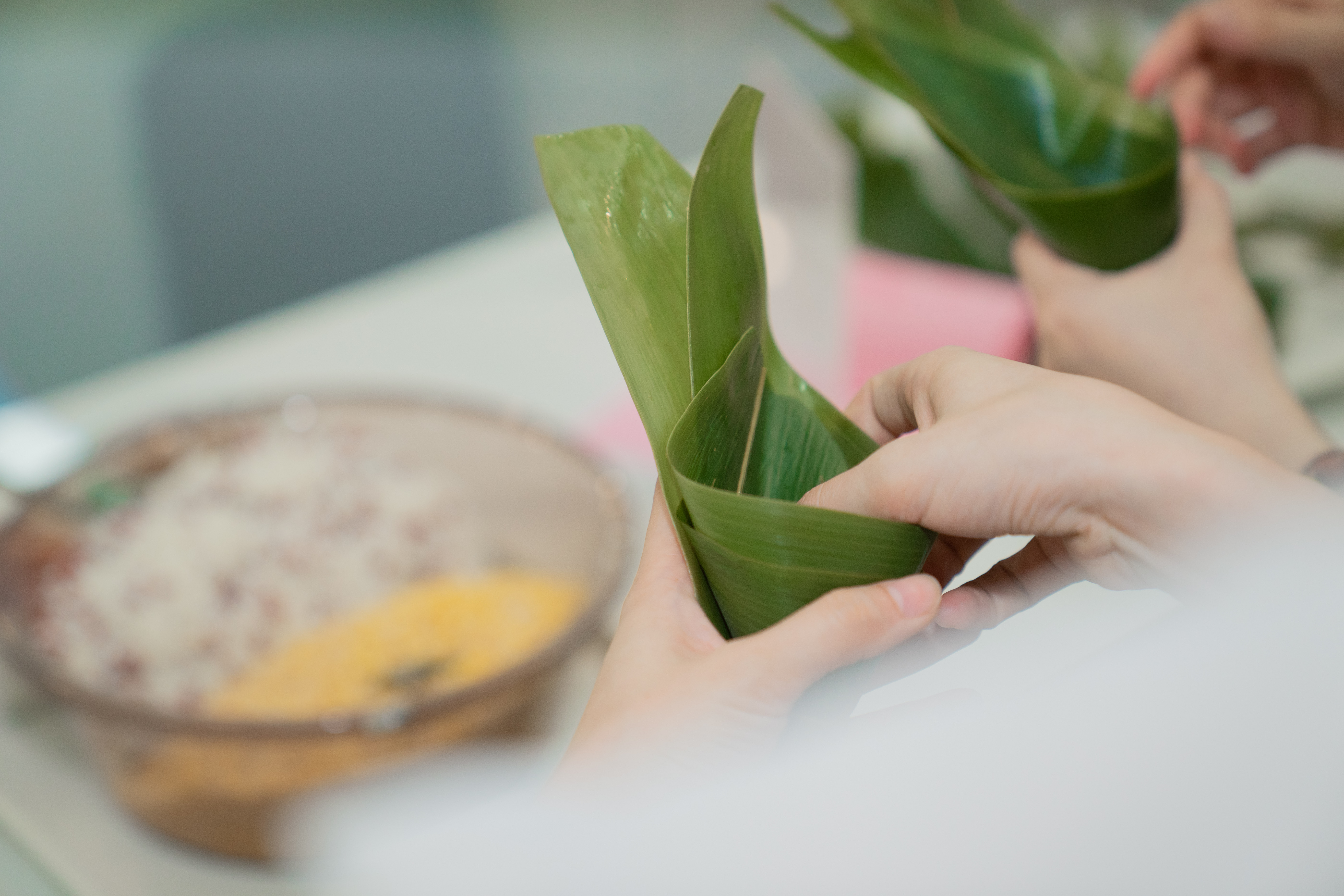 粽葉被或靈巧或笨拙得卷成漏斗狀,再舀上滿(mǎn)滿(mǎn)一勺顆顆飽滿(mǎn)剔透的糯米,塞進(jìn)自己喜愛(ài)的餡料。再翻折粽葉,捆上圈圈彩絲,一個(gè)飽滿(mǎn)精巧的粽子就此誕生!