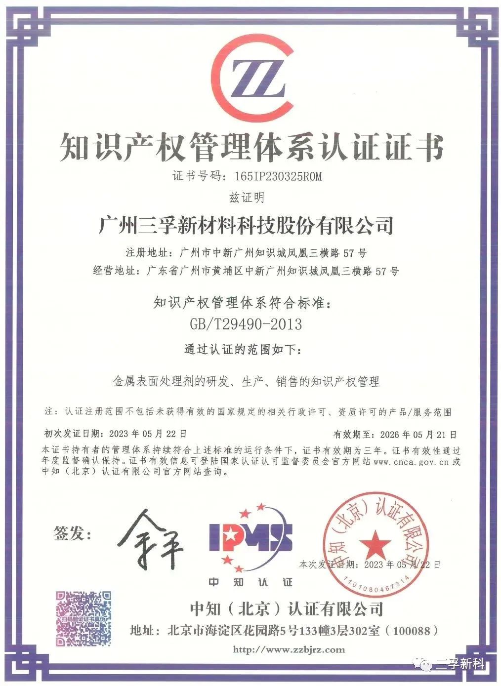 在今年5月,三孚新科獲批知識產(chǎn)權(quán)管理體系證書。這也為公司進(jìn)一步強(qiáng)化知識產(chǎn)權(quán)管理、規(guī)范和保護(hù)能力,打造知識產(chǎn)權(quán)強(qiáng)企,實現(xiàn)以“知產(chǎn)”武裝企業(yè)的目標(biāo),奠定了堅實的基礎(chǔ)。