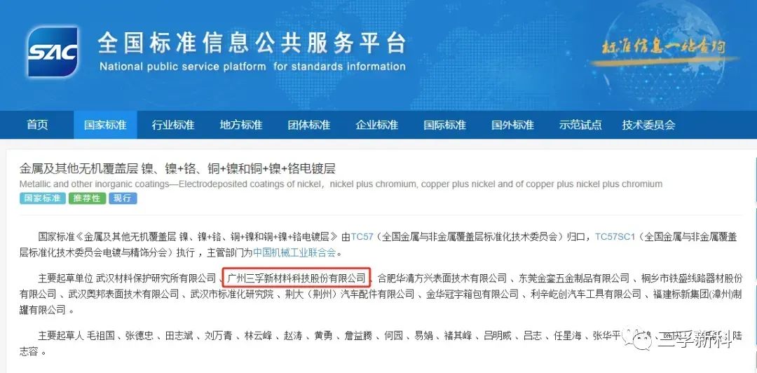 在知識產(chǎn)權(quán)管理之外,三孚新科也積極參與到行業(yè)國標(biāo)的制定工作中,如⌈GB/T 9797-2022金屬及其他無機(jī)覆蓋層 鎳、鎳+鉻、銅+鎳和銅+鎳+鉻電鍍層⌋、⌈GB/T 39495-2020 金屬及其他無機(jī)覆蓋層 鋁及鋁合金無鉻化學(xué)轉(zhuǎn)化膜⌋、⌈GB/T 43099-2023金屬及其他無機(jī)覆蓋層 錫鈷合金電鍍層(2024年4月1日實施)⌋,三孚新科均以主要起草單位參與國標(biāo)制定。三孚新科將持續(xù)協(xié)助推動行業(yè)國標(biāo)更新升級,為表面工程行業(yè)高質(zhì)量發(fā)展做出貢獻(xiàn)