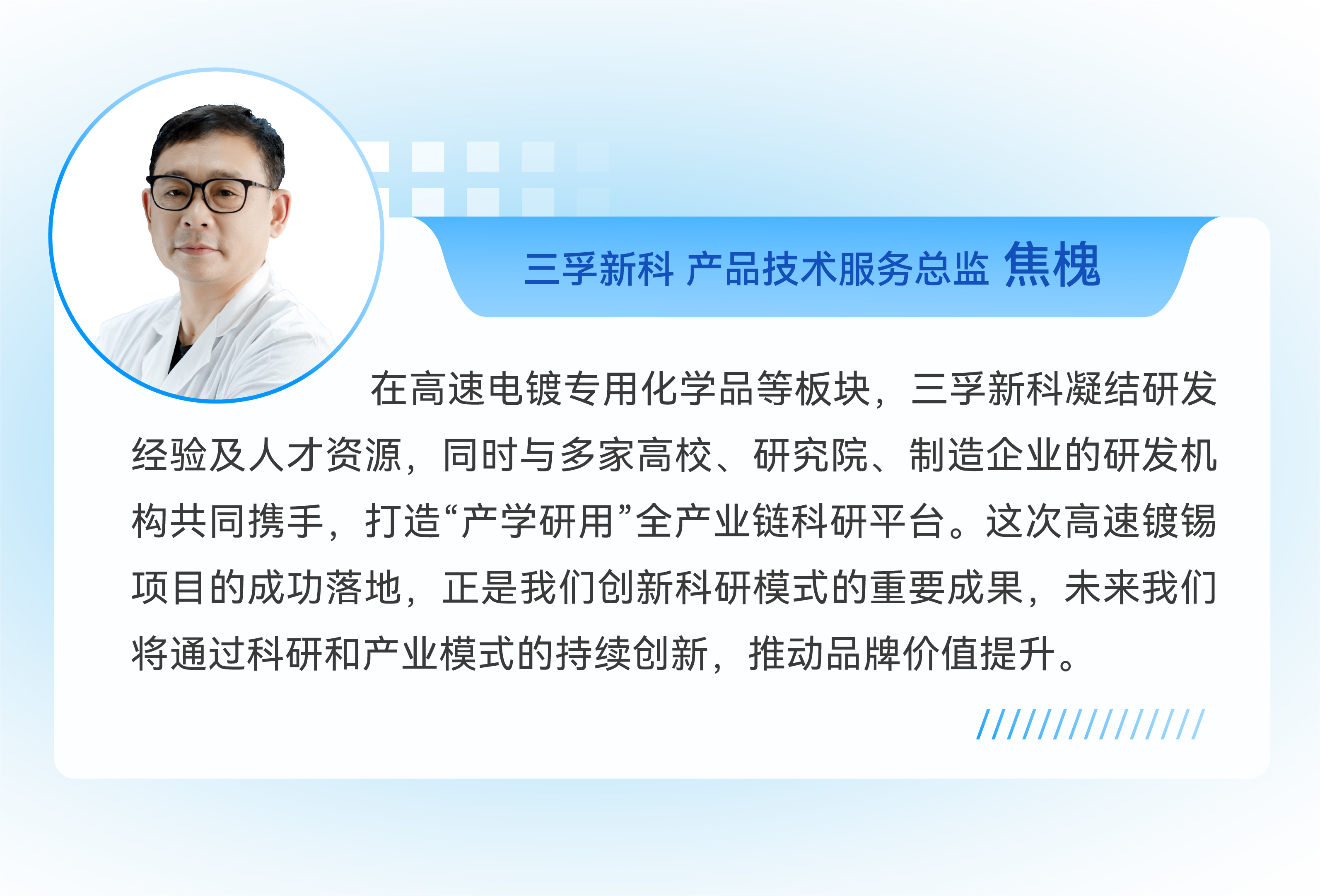 新烜新材料(泰州)有限公司產(chǎn)線原使用PSA體系高速鍍錫化學(xué)品,面臨著工藝穩(wěn)定性低、生產(chǎn)環(huán)境較差、廢水處理壓力大等問題。三孚新科基于在高速鍍錫專用化學(xué)品上的多年研發(fā)經(jīng)驗(yàn)及前期實(shí)驗(yàn)室小試經(jīng)驗(yàn),派駐專業(yè)研發(fā)技術(shù)團(tuán)隊(duì),與客戶共同完成PSA到環(huán)保型MSA體系的切換。