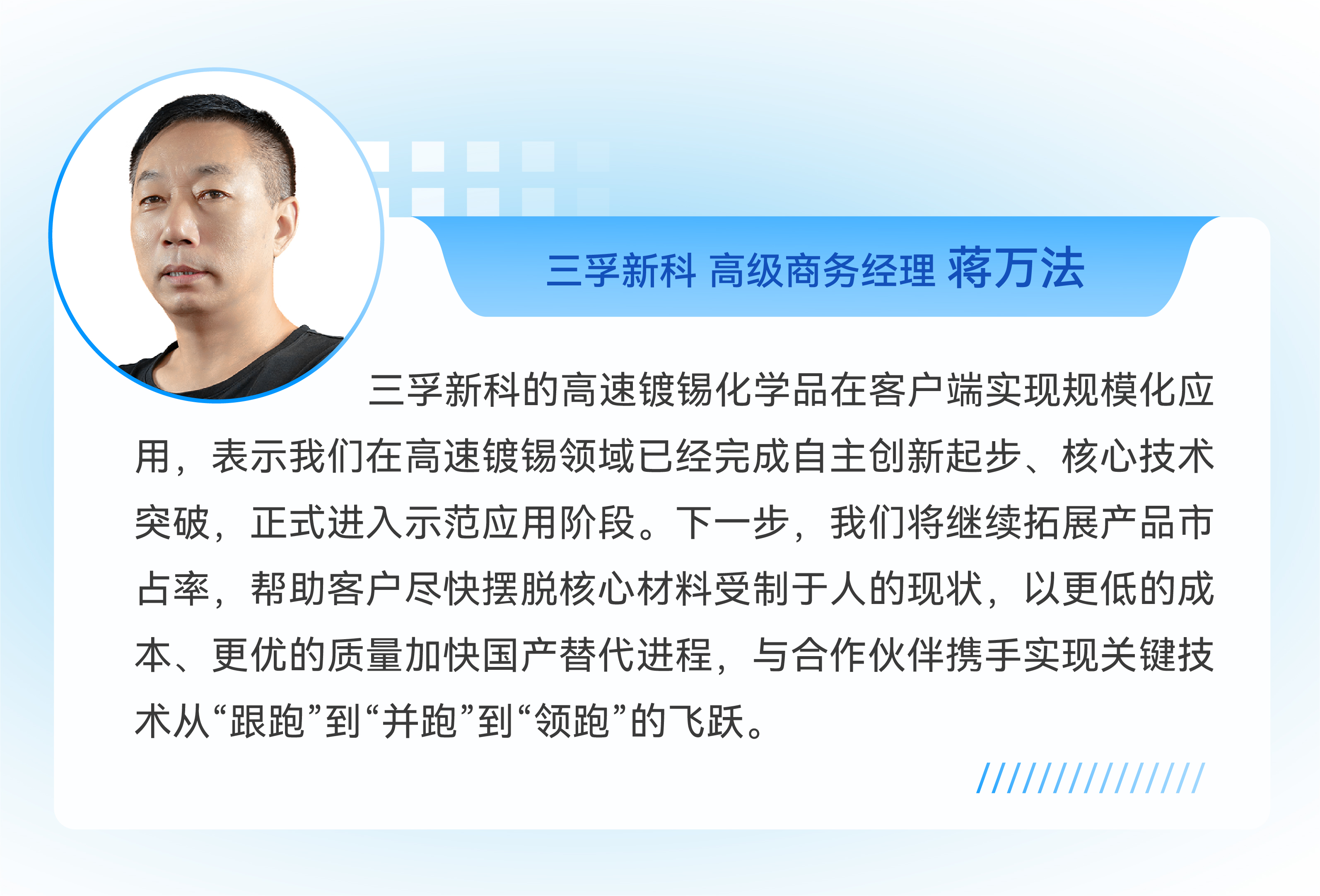 三孚新科高速鍍錫首個(gè)產(chǎn)業(yè)化應(yīng)用項(xiàng)目,已在新烜新材料(泰州)有限公司正式上線并已成功運(yùn)行1個(gè)月,各項(xiàng)指標(biāo)表現(xiàn)優(yōu)異,實(shí)現(xiàn)產(chǎn)業(yè)化應(yīng)用!