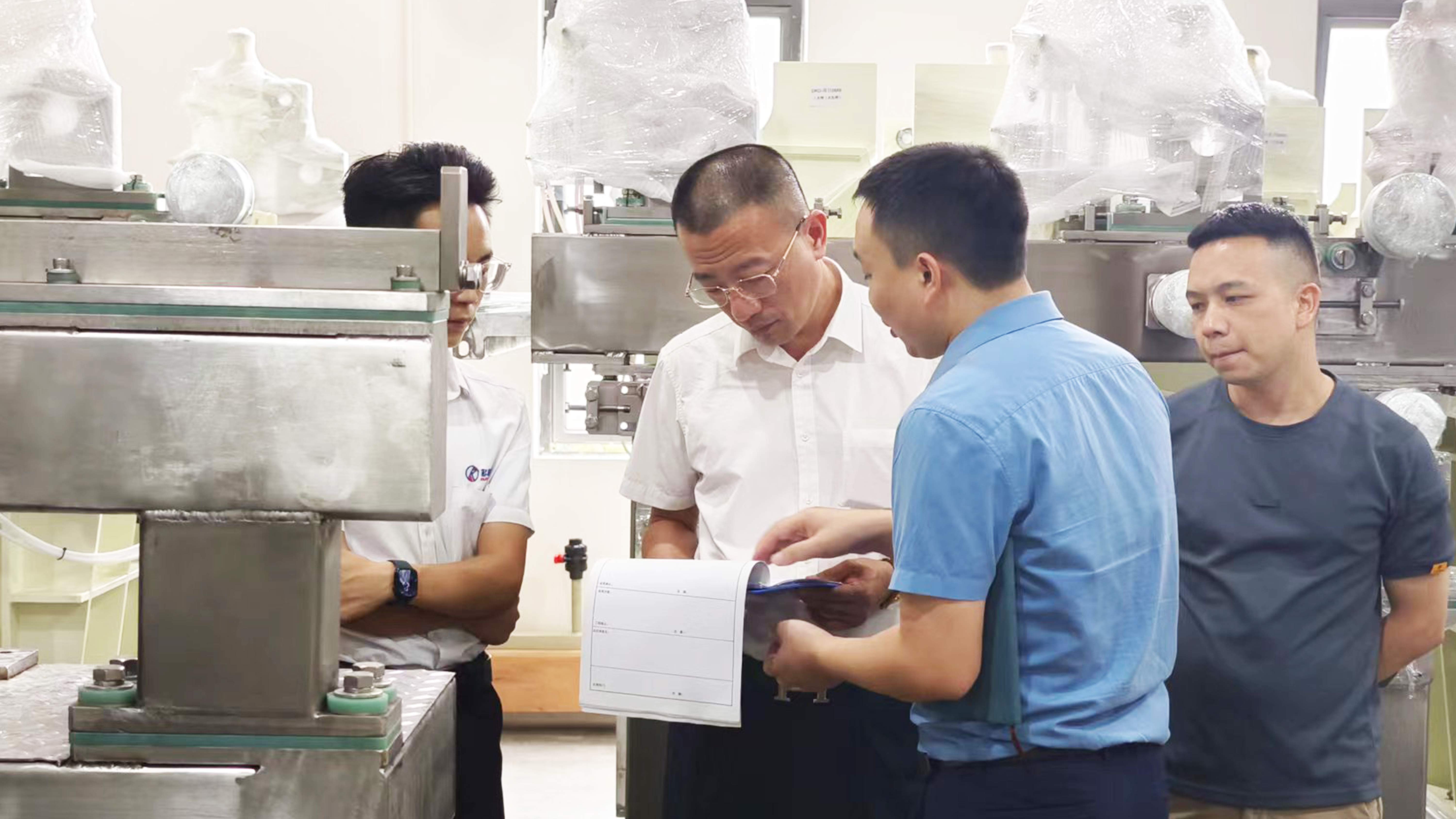 嘉元科技第一站來(lái)到三孚新科設(shè)備制造車(chē)間,深入了解公司裝備的制造能力和精度,針對(duì)“一步式全濕法復(fù)合銅箔設(shè)備”的設(shè)計(jì)、制造等展開(kāi)交流。